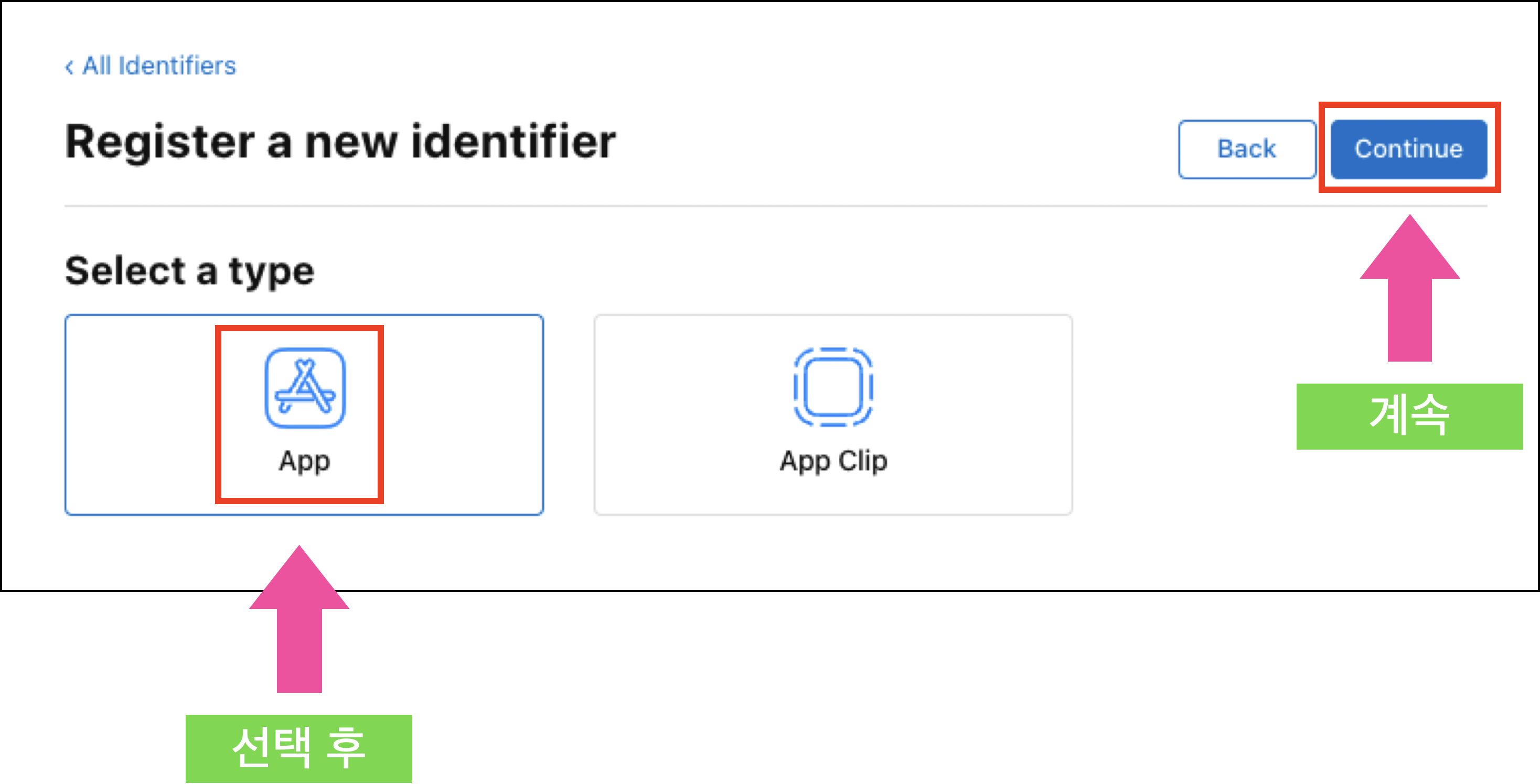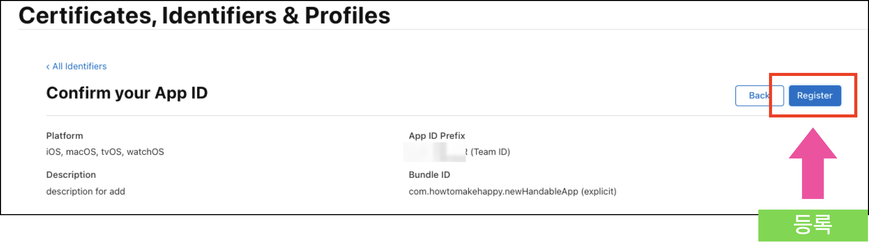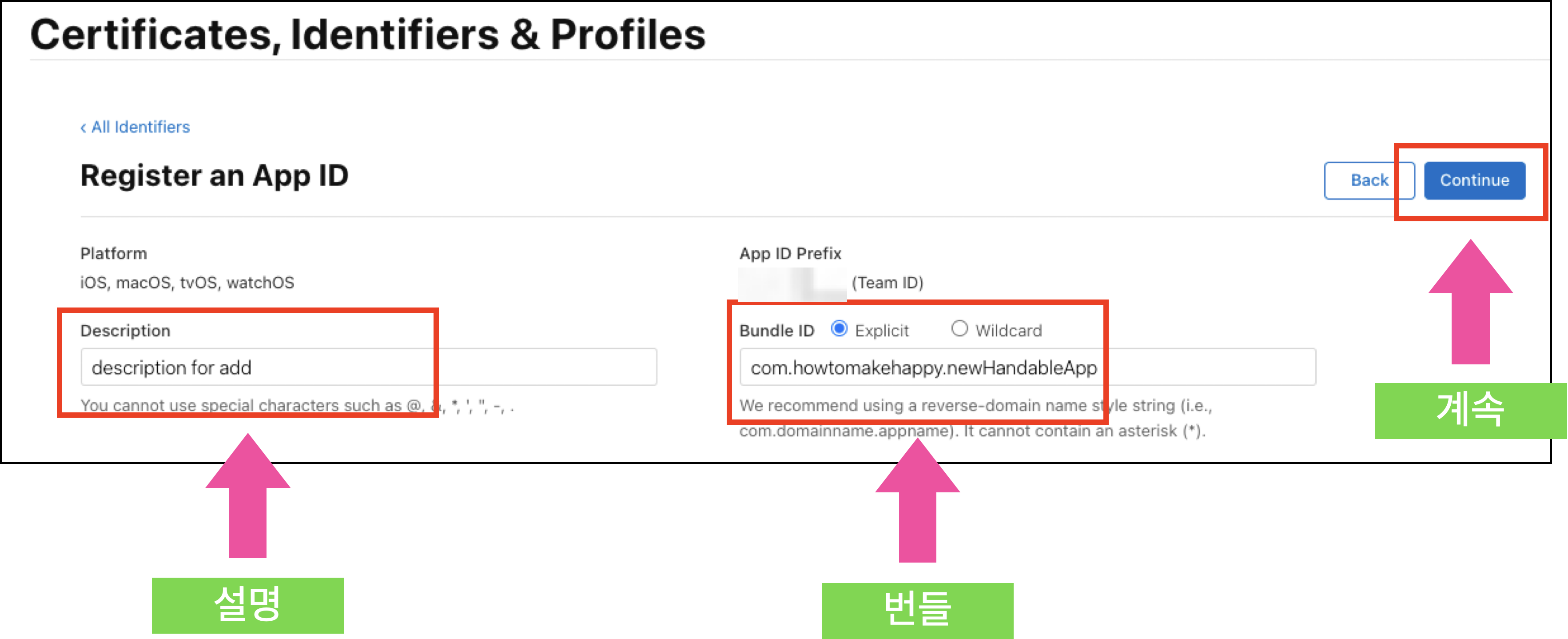 Apple 개발자 사이트에서 App ID를 등록하는 방법입니다.(사전에 애플 개발자 계정이 준비되어있어야 합니다.)