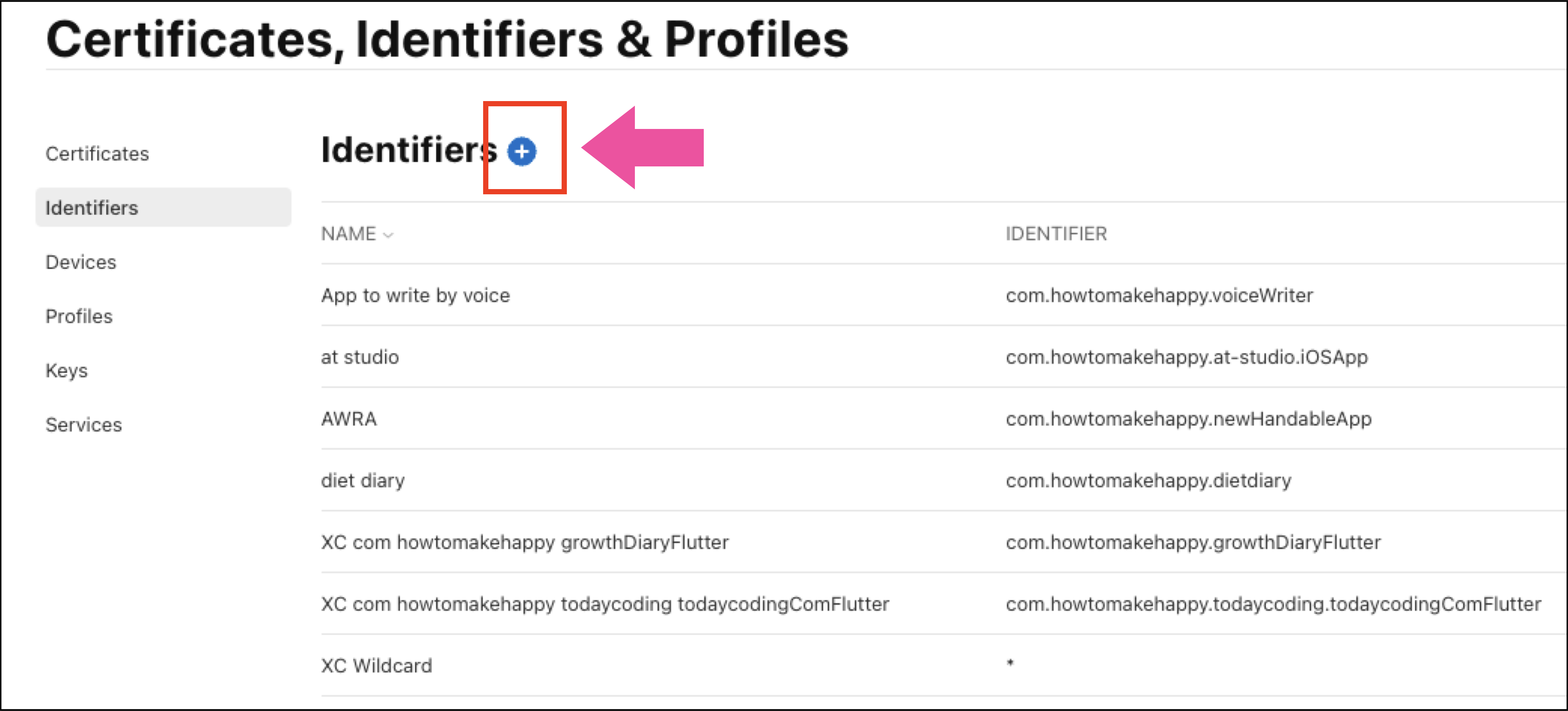 식별자 목록 화면(아래 링크)에서 추가(+아이콘)를 누르고 App ID 등록을 시작합니다.