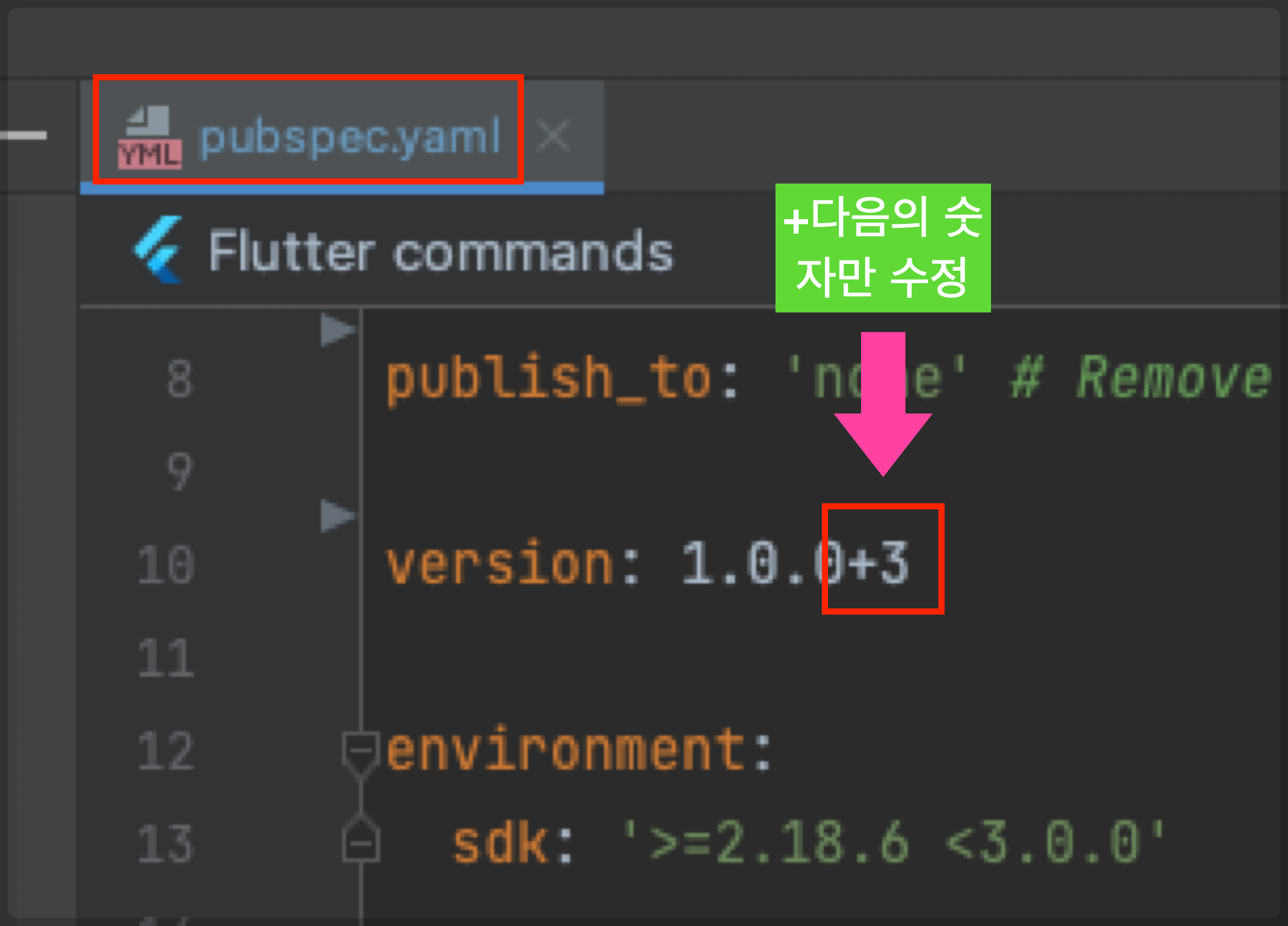 pubspec.yaml 파일에서 version 필드를 찾습니다. "+" 다음에 있는 숫자가 버전코드입니다. 1 올려줍니다.