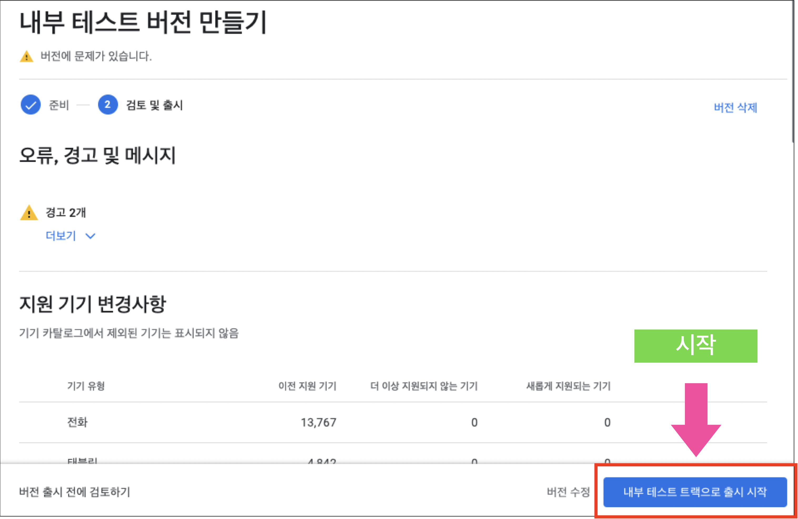 오류 및 경고 확인 후 배포 시작