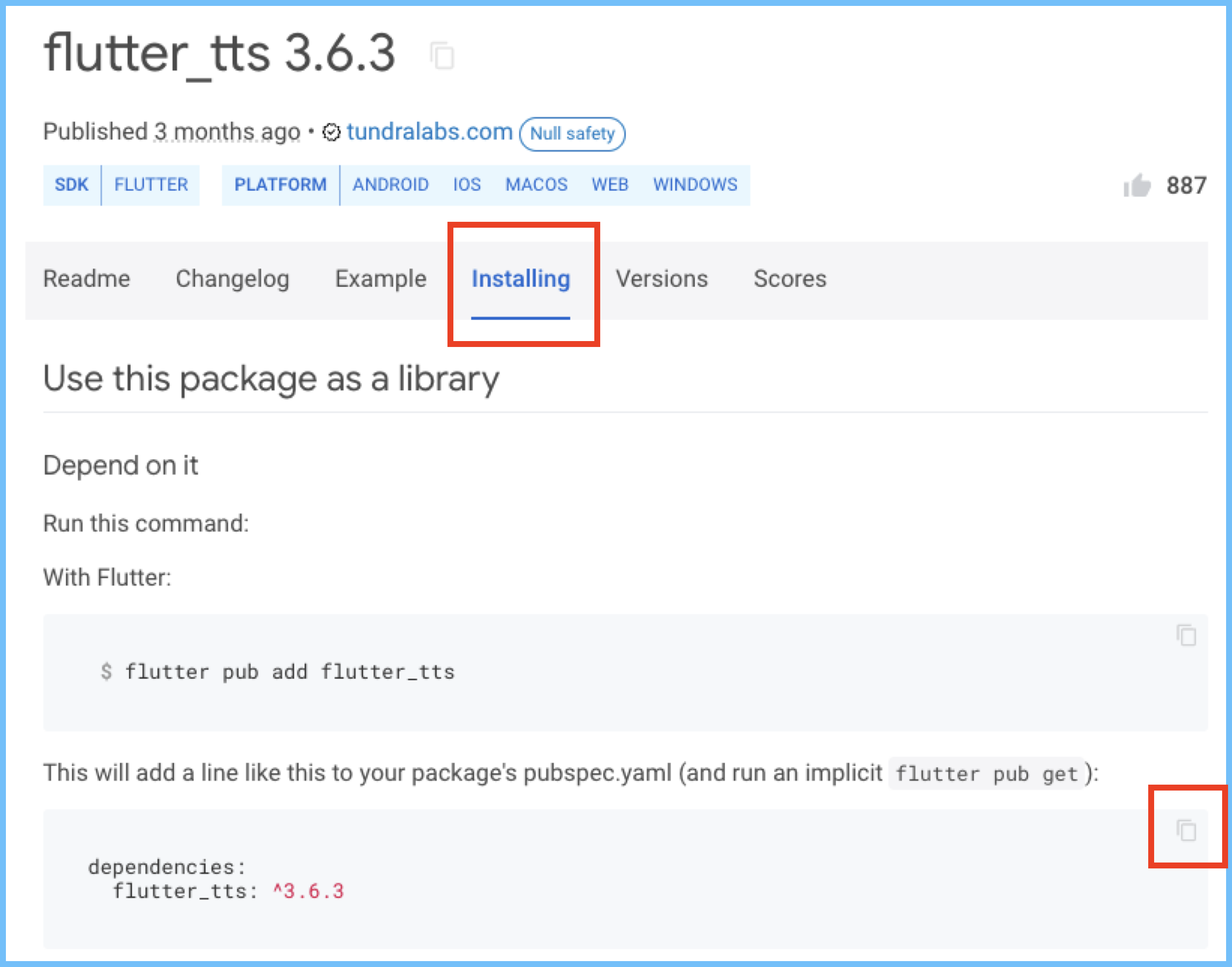 설치 탭을 클릭하고 dependencies: 정보를 복사합니다.