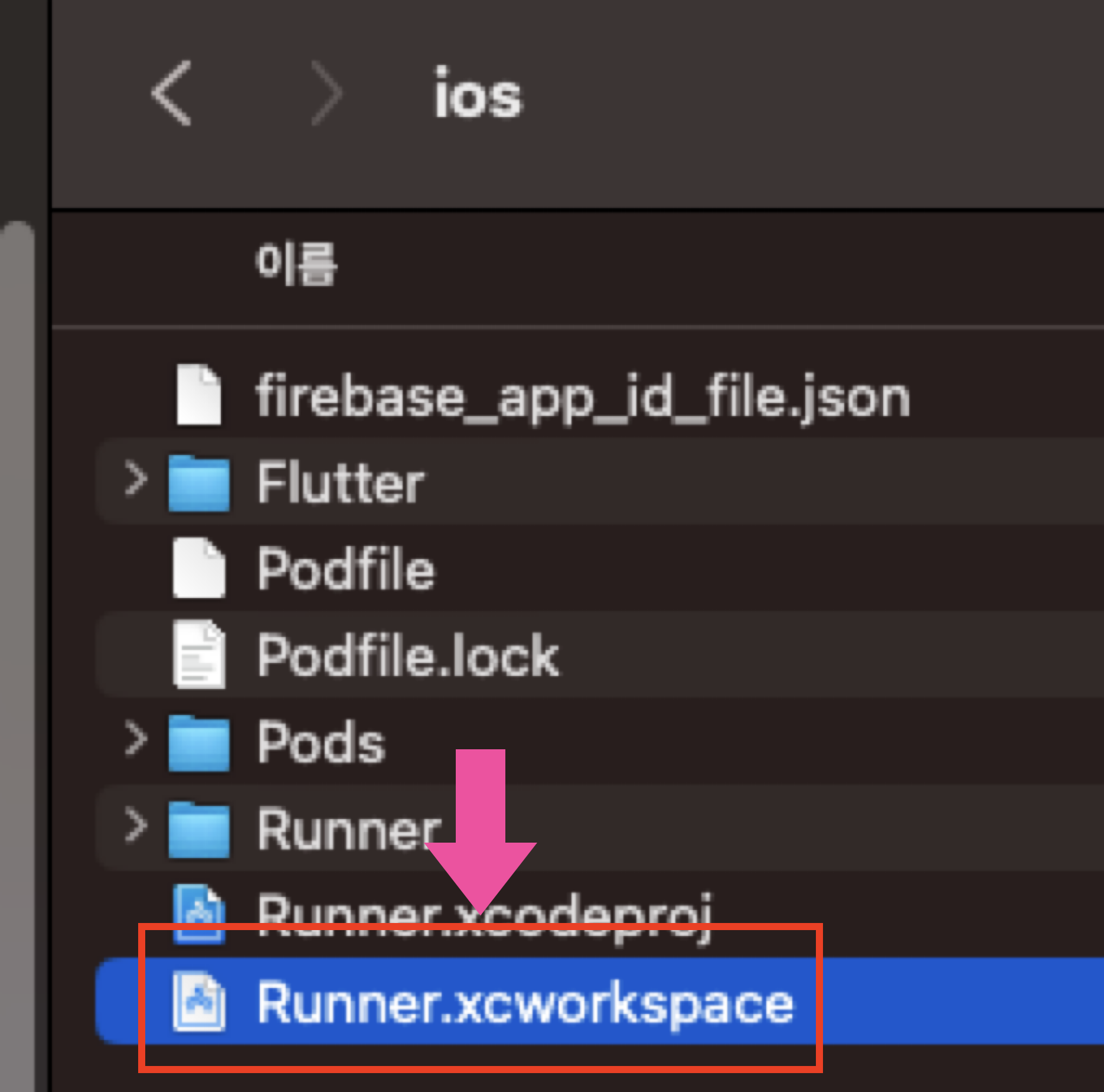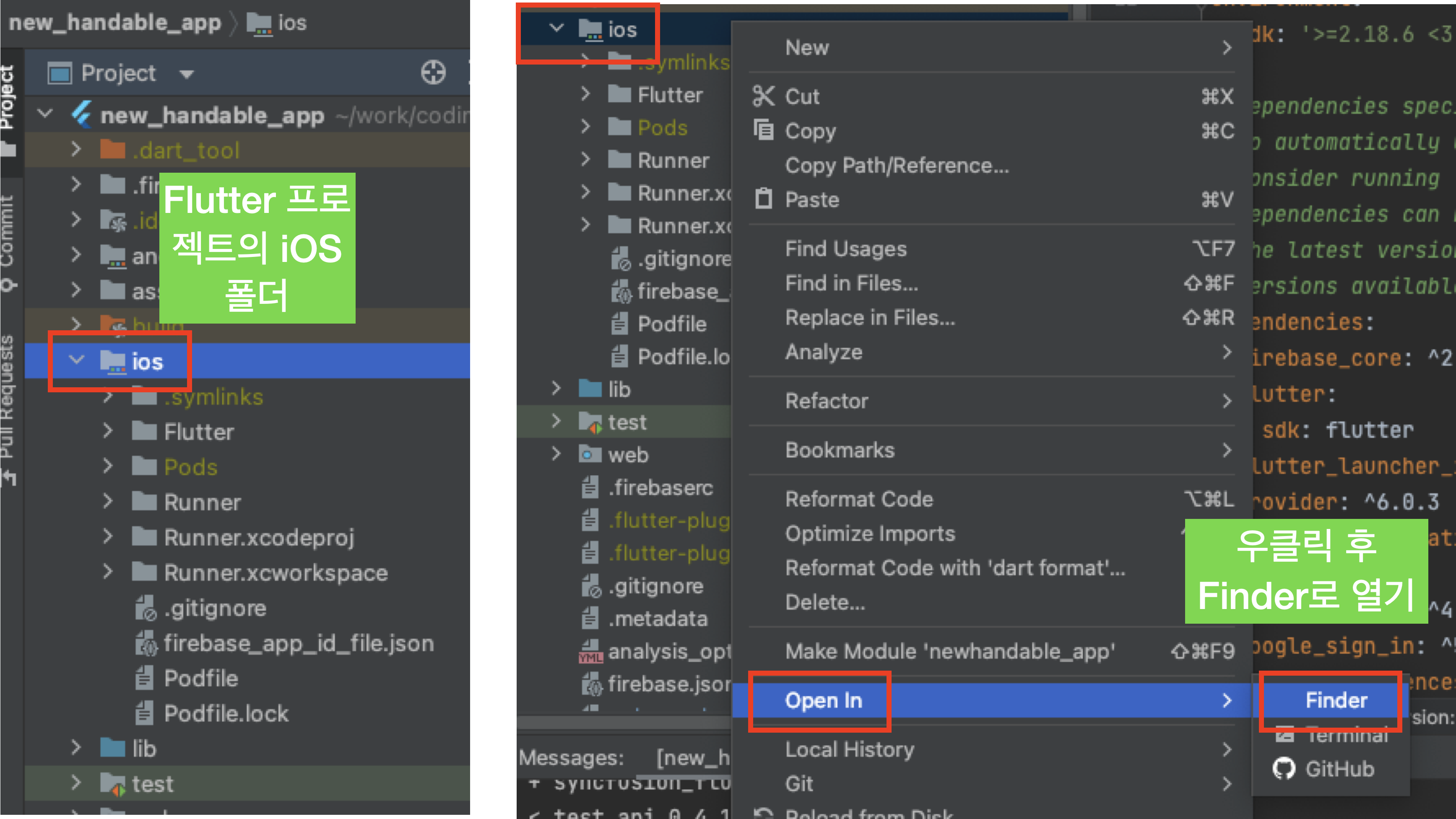 안드로이드 스튜디오의 프로젝트 탐색기에서 iOS를 선택하고 우클릭을 하여 Finder로 엽니다.