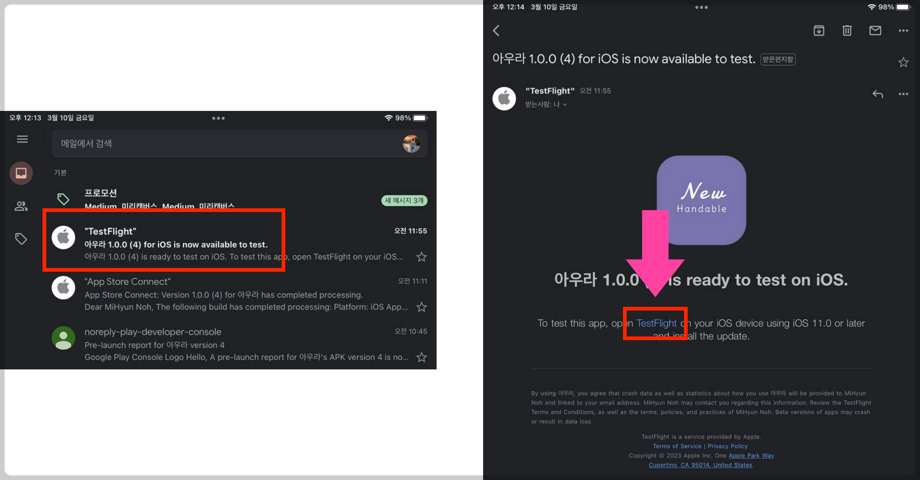 이제 TestFlight 앱 또는 Test 배포 안내 이메일을 통하여 버전을 설치할 수 있습니다.