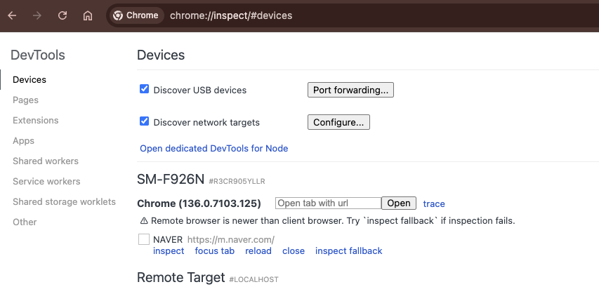 HTML화면이 PC 크롬의 모바일 모드에서는 잘 나오는데 휴대폰에서는 잘 안나오는 경우 디버깅하는 방법 카테고리 없음 by 코나인 2025. 5. 28. 반응형 1. USB 연결 후 크롬2. PC 크롬 주소창에서 "chrome://inspect" 입력 반응형 공유하기 게시글 관리 투데이코딩닷컴 코딩블로그 저작자표시 (새창열림) 댓글