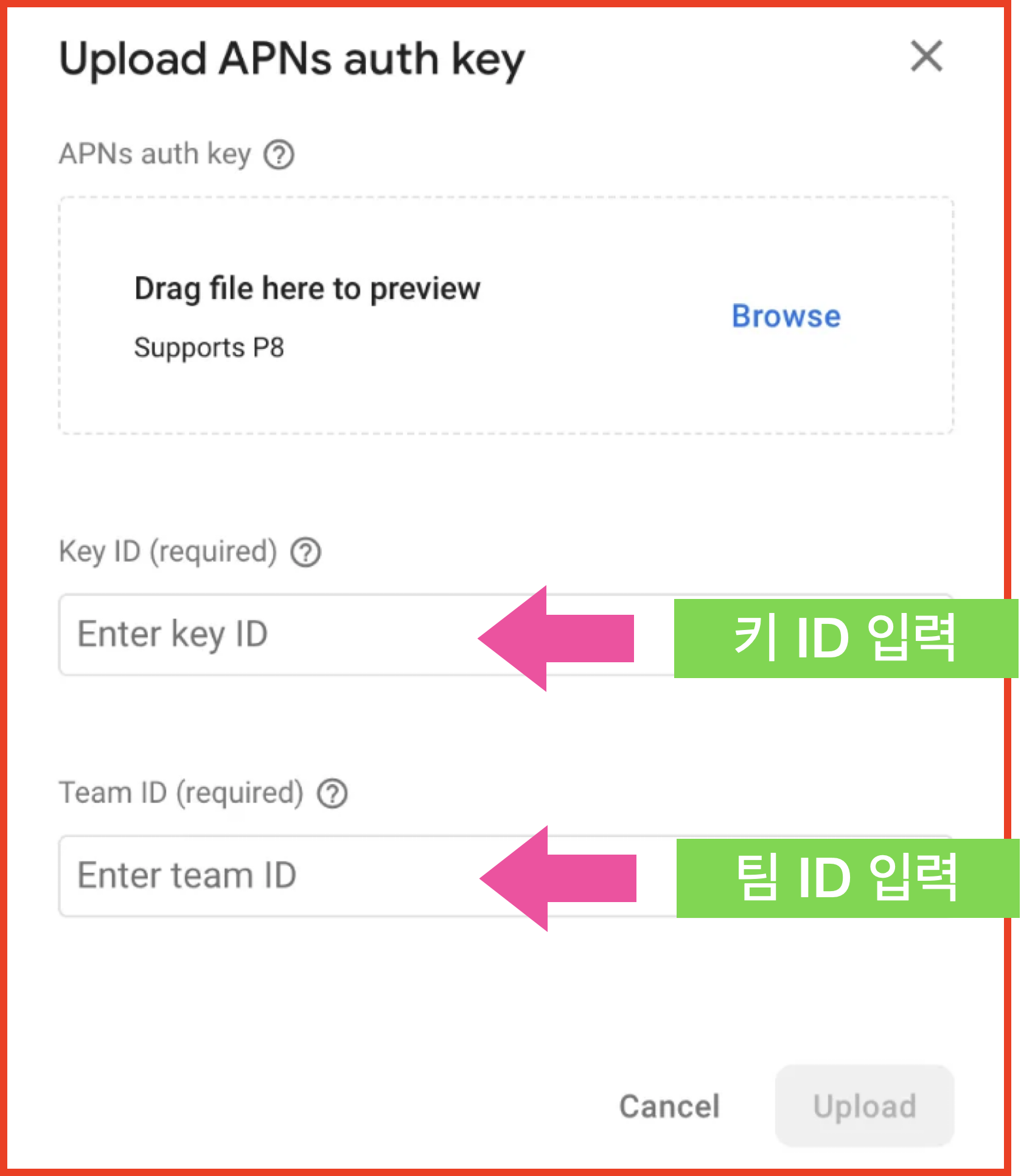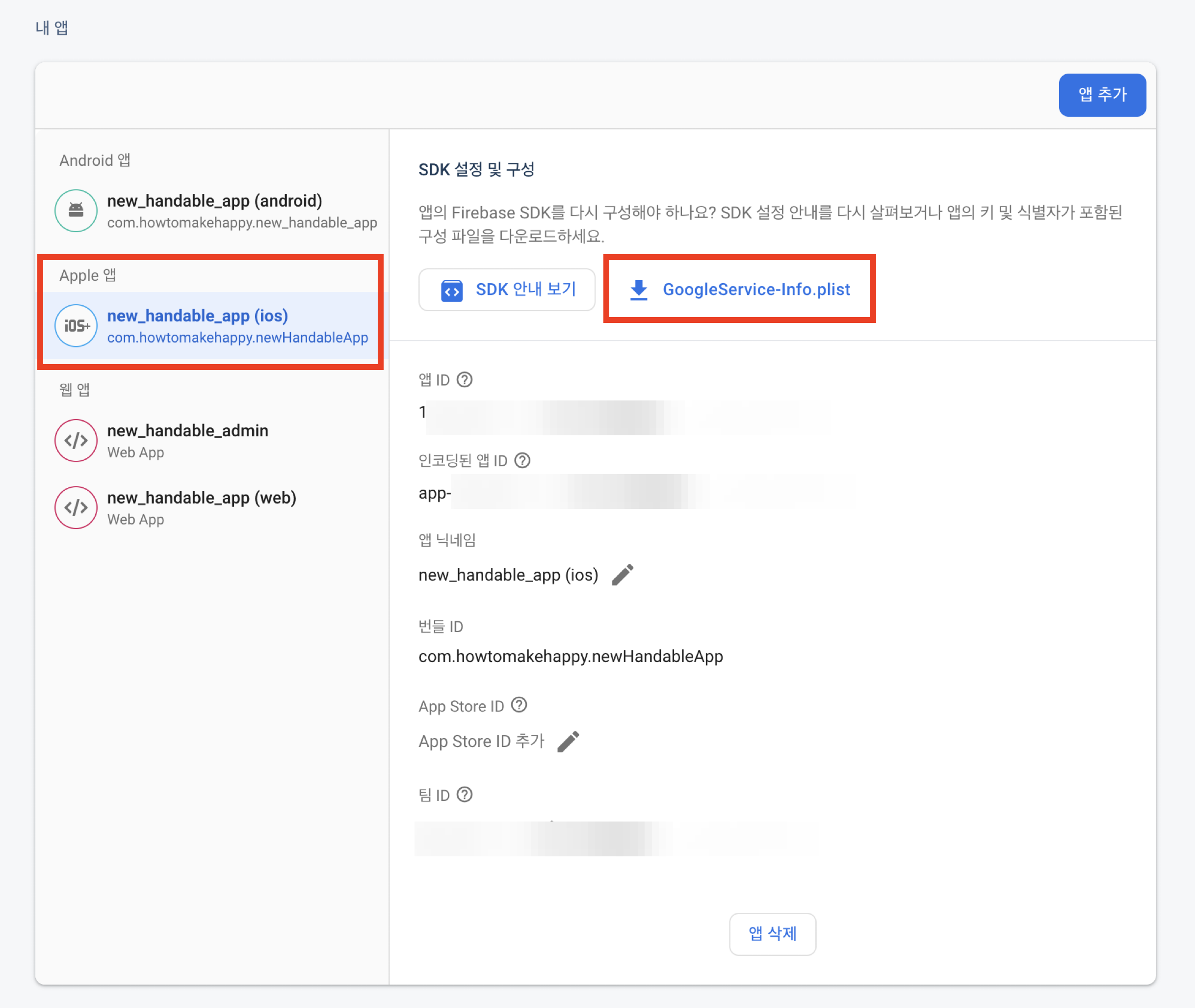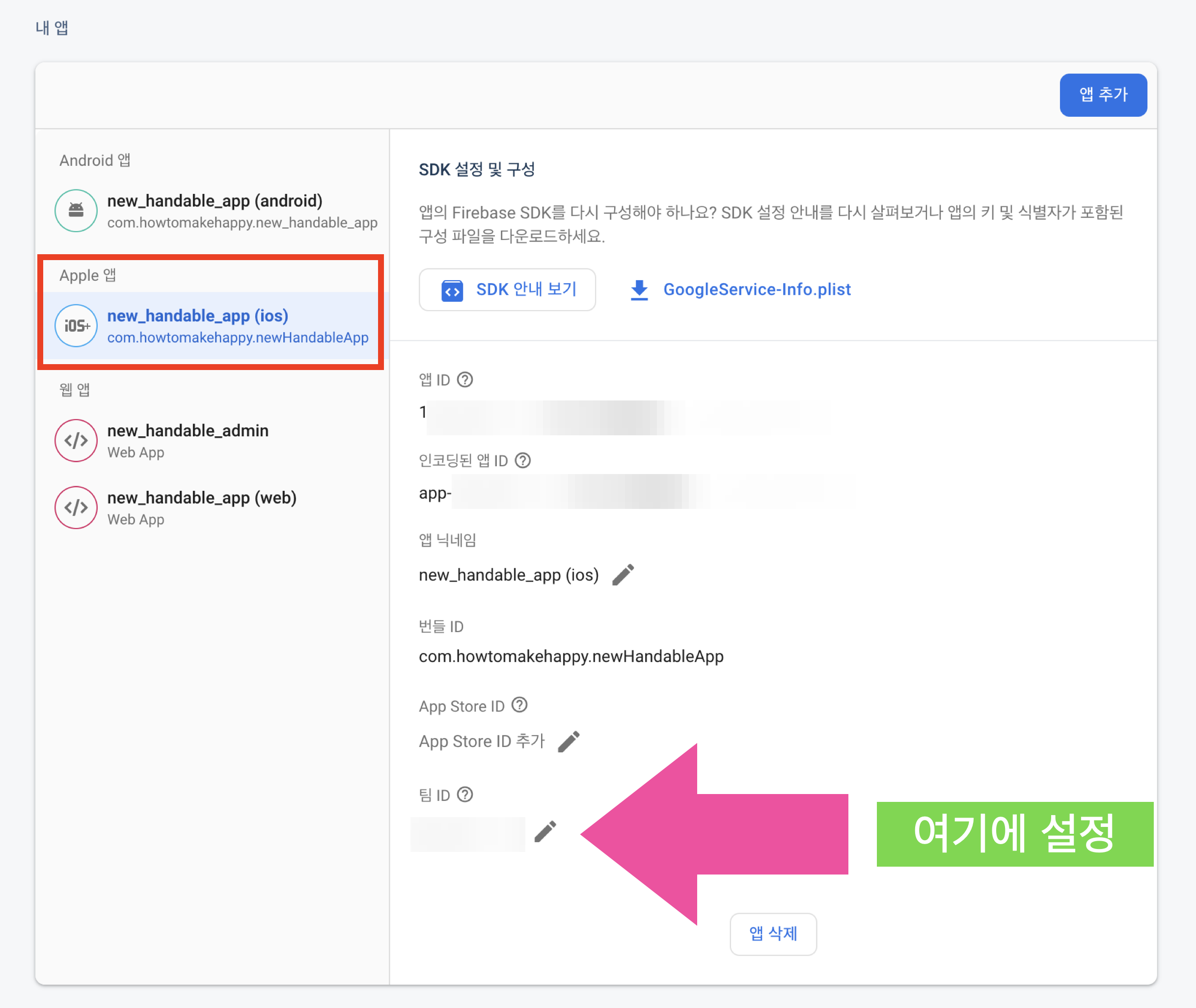 파이어베이스 콘솔로 돌아와서 팀 ID를 설정한다.