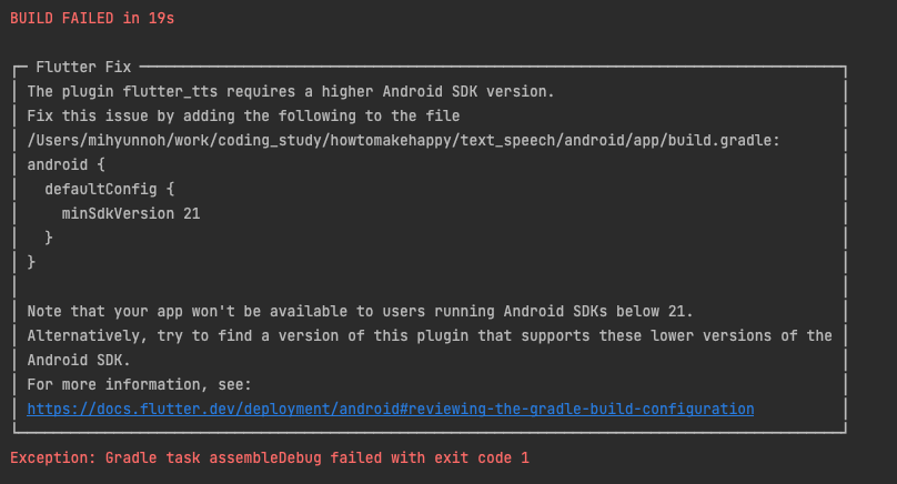 "flutter.minSdkVersion" 또는 "flutter.targetSdkVersion"등의 버전을 수정해야할 일이 가끔 있습니다. 어떤 패키지를 설정하고 설치를 진행하다보면 아래와 같이 버전이 낮아서 빌드에서 실패하는 경우가 있습니다.