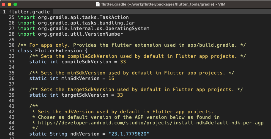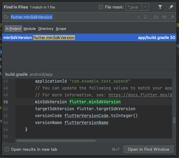 하지만 "flutter.minSdkVersion" 또는 "flutter.targetSdkVersion"로 검색을 해도 사용된 위치만 있을 뿐 선언된 위치는 검색되지 않습니다. 그 이유는 해당 정보가 프로젝트 내에 있지 않고 플러터 SDK 경로안의 gradle에 있기때문입니다.